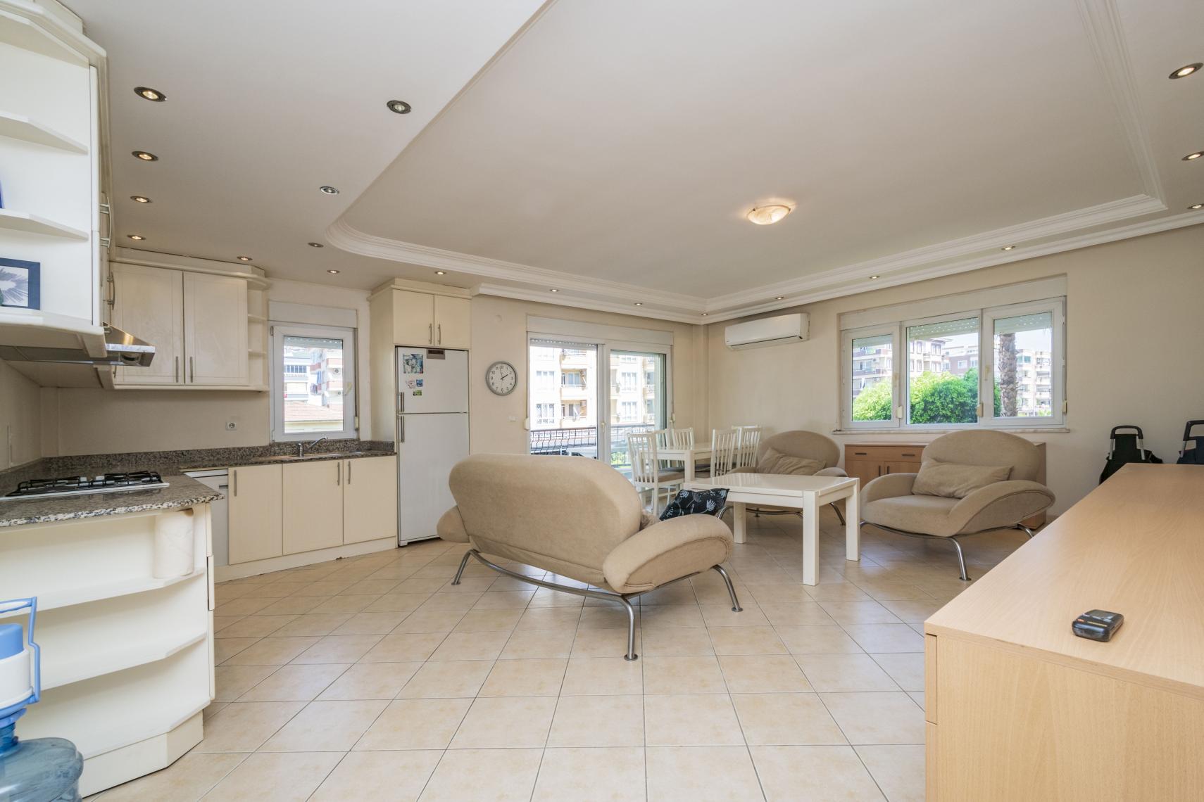 Локацията е идеална – на 2 минути пеша от най-близкия плаж и търговски улици. Центърът на Алания се намира на 5 минути разходка, а най-близкото летище е на 40 минути път с кола. В близост има детска площадка, спортни съоръжения и речна зона. Кварталът съчетава спокойствие с лесен достъп до услуги и транспорт.