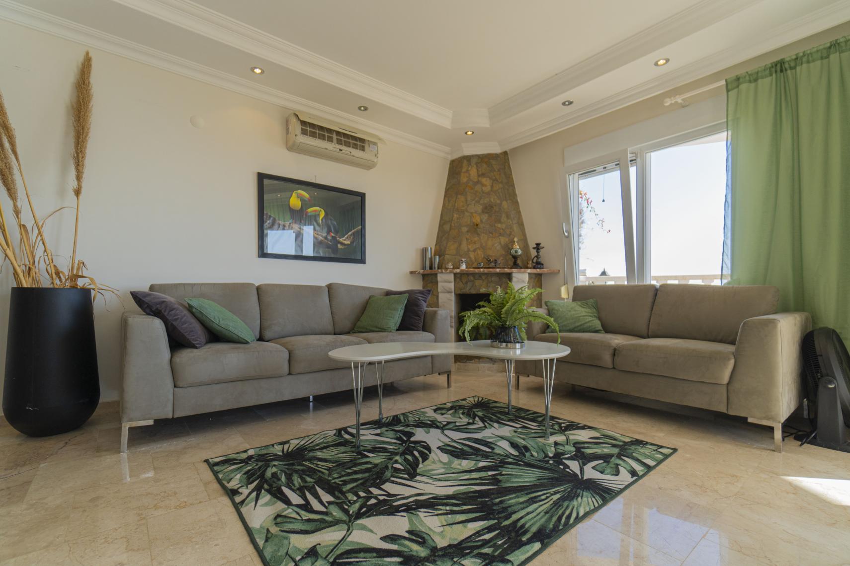 Oro kondicionavimo sistema su šildymu ir šaldymu gyv. kambaryje ir miegamuosiuose. Patrauklus židinys. Viena dvigulė lova, dvi viengulės. .
