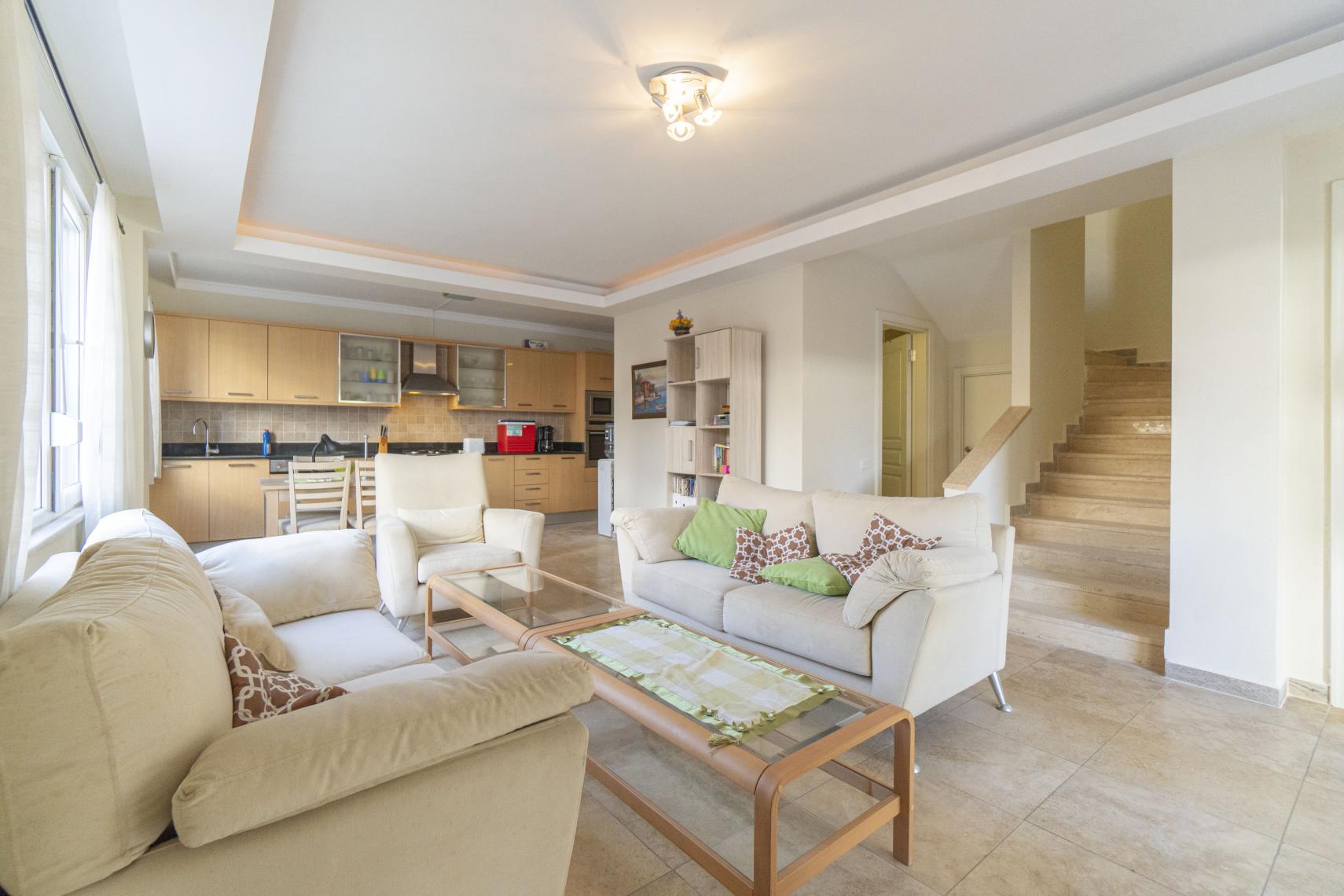 Gaisa kondicionieris apkurei vai dzesēšanai gan viesistabā, gan guļamistabās.. Brīvdienu māja ir pievilcīgi mēbelēta burvīgā Eiropas stilā.. Amerikāņu virtuve ar cepeškrāsni, plīti un ledusskapi.. Mēbelēts balkons ar galdu un krēsliem..