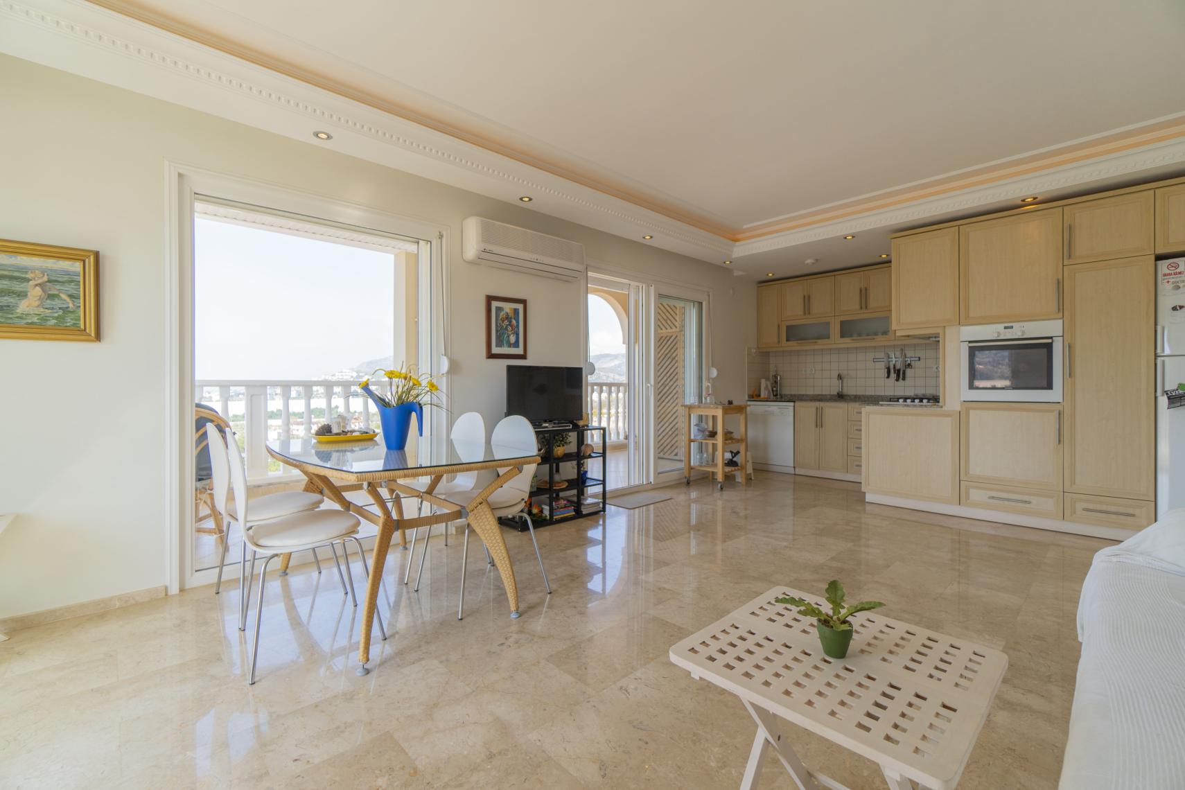 Aircondition for oppvarming og nedkjøling av både stue og soverom. Et fredfullt feriehjem, møblert og klart til overtagelse.. Amerikansk kjøkken med stekeovn og kjøleskap. Feriebolig med innbydende balkonger perfekt for de varme sommerkvelder.